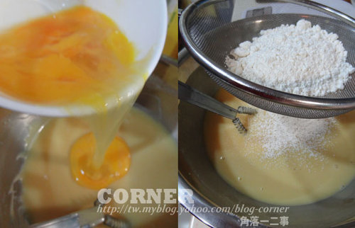 4.加入過篩低筋麵粉,拌勻。